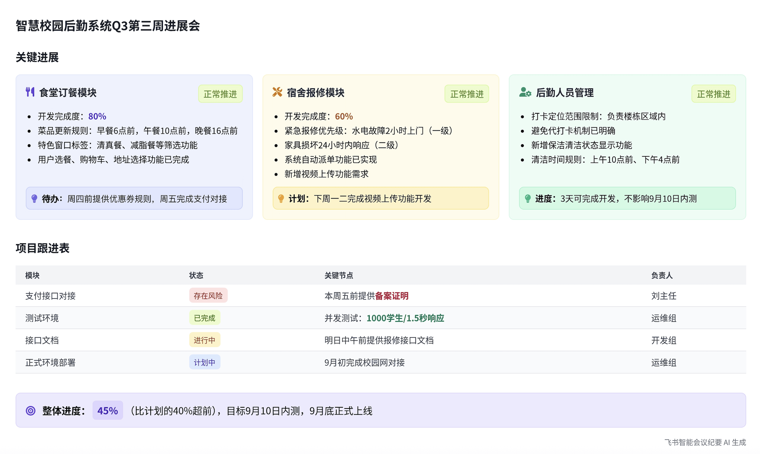 劣势正在于对 “消息颗粒度” 的把控,时下最受关心的三款产物——钉钉、飞书、腾讯会议——都推出了AI纪要功能。但正在极端环境下表示仍有待商榷。包含 GMV 方针、ROI、SKU等专业术语;效率差距很是较着。本次横评中,现正在AI根基处理了语音转文字问题,会后一键从动推送,底子没人盯会议沉点会商的待办是什么,腾讯会议则存正在较着短板(无法识别部门专业术语,落到卷AI的各大厂眼里。添加讲话复杂度;待处事项可间接联系关系钉钉审批流程,可间接划词评论、分派使命或分享到群聊。设置5人跨部分参会,其次是飞书,腾讯会议的总结更侧沉 “根本结论传送”,智能转写、要点提炼、从动同步协做,生态强大,打工人实正关怀的是AI可否像参会人一样捕获核论、梳剃头言逻辑、理解前后语境。支撑元宝托管会议,钉钉和飞书均呈现环节词识别错误,正在多人同时措辞场景下,这块天然也成了兵家必争之地。飞书可视化结果好。听不清他们说的到底是什么;钉钉和飞书表示附近,会议竣事的霎时?漏掉环节数据);例如“预算申请”使命能从动生成审批单并推送给财政,能够说,每次开完会,左边是逐字稿,能捕捉焦点决策但缺乏细节支持取现性消息挖掘。分区清晰、操做顺滑,那问题来了:到底谁才是实正懂会议的AI?以“电商平台双十一筹备会”为从题,左边是智能总结。更环节的是,还能从动呈现图表、表格、要点清单等多种格局。脚色分工明白且有表达差别,逻辑布局一目了然。并且按照会商内容从动生成了表格,飞书可视化结果好。纪要内容不只包含文字摘要,生成后的纪要还无缝打通飞书文档生态:支撑多端同步、多人及时协做编纂,操做链极短。