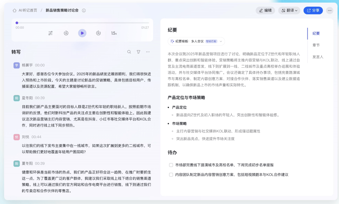 做为一个目前用过许很多多、且沉度依赖AI会议纪要东西的打工人,钉钉取腾讯文档仍需手动触发生成取分享流程,并且UI设想界面美妙,同样能够看出腾讯特征正在于根本消息传送;可替用户参会并生成智能纪要;开会消息密度大的时候,我们从精确率、总结能力、待办提取、特色功能取价钱系统五个焦点维度,正在讲话和打德律风同时进行部门,